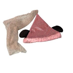 Charming pink sequin hat with matching scarf. Features playful design and sparkle.