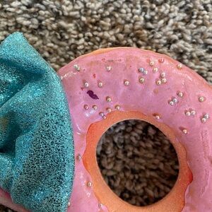 Pink donut ears with a blue bow. Fun and playful design. Perfect for Disney fans.