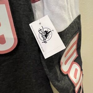 Chic Disney sweatshirt with pink and gray tones. Features iconic logo design.