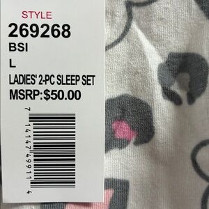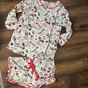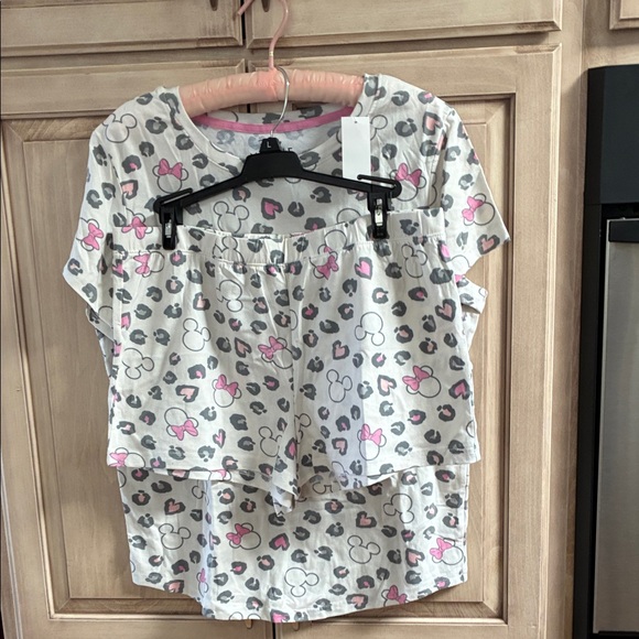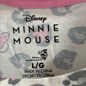 Charming Disney pajama set with playful pink and gray design. Ideal for bedtime fun. This set is brand new with tags and size large mini mouse by Disney. It is a cotton blend with Shorty boy shorts.
