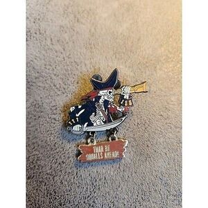 Disney Pirates Of The Caribbean 2006 Legend of the Golden Pins Skeleton Pirate Telescope Pin. This is a dangle pin that reads "Thar be squalls ahead!" The pin is like new, the backer card shows wear from storage.