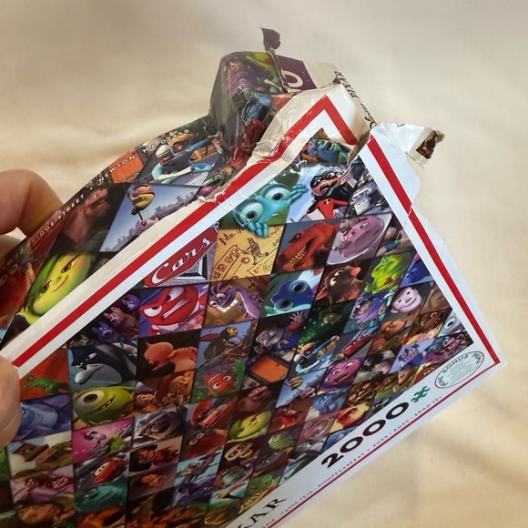 Colorful Disney Pixar 2000-piece puzzle featuring beloved characters. NIB. BAG HAS NEVER BEEN OPENED. For the puzzle lover. Ages 12 & up. Included is a bonus puzzle poster. Corner of box is damaged but the bag of puzzle pieces are NOT damaged. Finished size 38” x 26” SFPF HOME