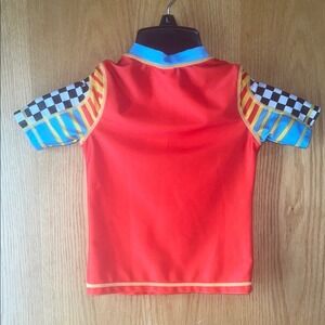Keywords: Disney, Pixar, Cars, Lightning McQueen, Rash Guard, Swim Shirt, Size 4, Boys Swimwear, Kids Swimwear, Sun Protection, Beachwear, Pool, Red, Checkered Flag
