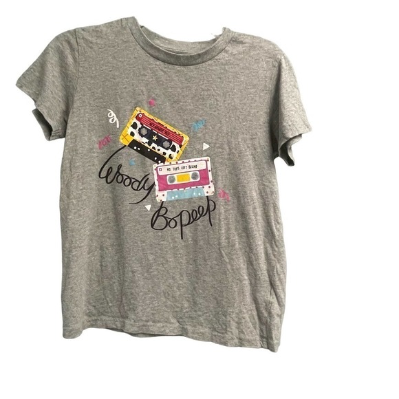 Gray short sleeve t-shirt featuring a graphic print of Woody and Bo Peep themed cassette tapes, size Small