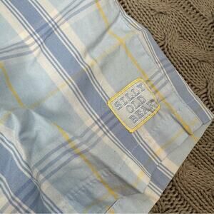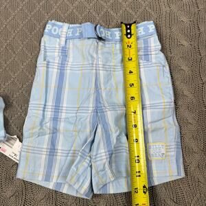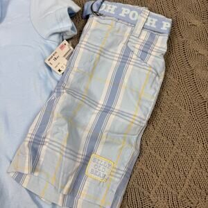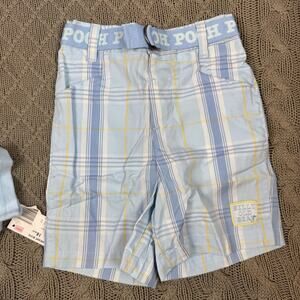 Adorable Pooh themed short sleeved baby blue polo one piece with snap closure and blue plaid pull on shorts. Check out the adorable belt!