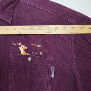 This Disney Pooh Button-Up Shirt in Women's XL size is a charming addition to any wardrobe, featuring a solid purple color with embroidered Winnie The Pooh and Tigger character accents. Made of 100% cotton corduroy fabric, this collared shirt with long sleeves offers a regular fit and comes with a convenient button closure and pockets. Perfect for fans of cartoons and Disney, it is machine washable for easy care.