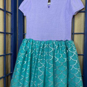 Adorable Disney Princess Ariel–inspired mermaid dress in a soft knit top and sparkly teal scale-patterned skirt. This dress is perfect for everyday play, dress-up, park days, birthday parties, or any little Ariel lover!