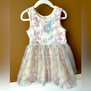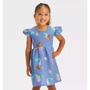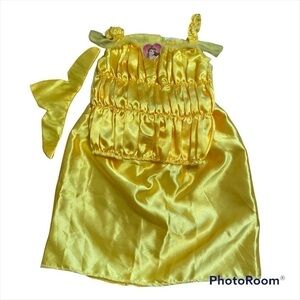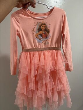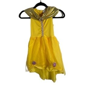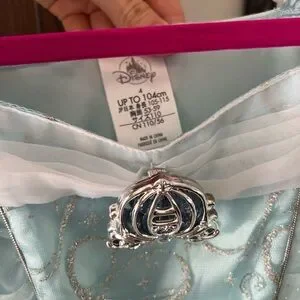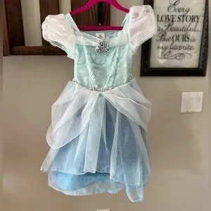 Disney princess dress in light blue with white sheer overlays. Sparkling tulle skirt and puff sleeves add fairytale charm. Decorative silver-tone brooch and subtle glitter details. Ready for imaginative play and dress-up fun.