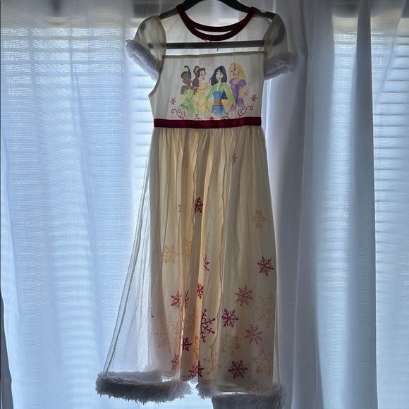 Charming Disney princess nightgown. Cream with red snowflake accents. Features beloved princesses. Soft and comfortable.