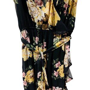 This dress exudes effortless elegance with its floral design and sheer overlay. The belted waist and wrap style flatter the silhouette, perfect for special gatherings.