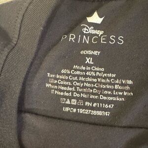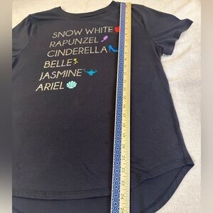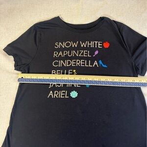 Black Disney princess graphic tee in good, pre-owned condition. Features a curved hem and a pressed princess name list design. Approximate flat lay measurements are shown in the pictures. From a smoke-free home.