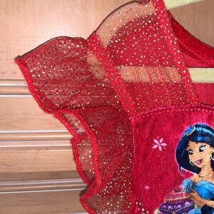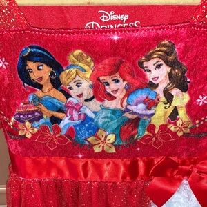 Charming Disney Princess nightgown in red and gold. Features white trim and glittery details.