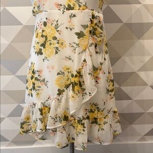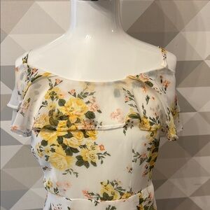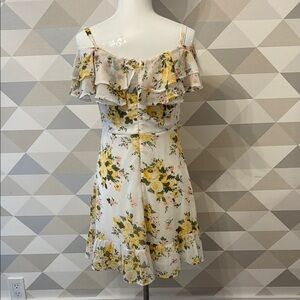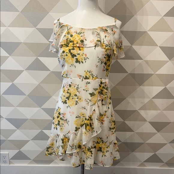 This charming white mini dress features a ruffled, tiered design with a flutter sleeve and an off-the-shoulder neckline. Perfect for a wedding guest or cocktail event, its playful tiers and delicate ruffles add a touch of elegance and movement.