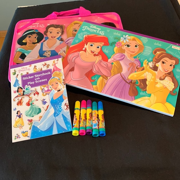 This is a really cute set. It includes the Disney Princesses coloring book and sticker book. The sticker book has pages to fill out. The sticker book, as shown in the pictures, does have a few stickers gone off the first page. But the rest are intact. The coloring book has a couple pages colored but the rest is perfect. It includes five markers and the lap board. The coloring book can be secured with elastic pieces in each corner.