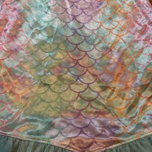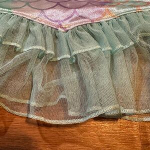 This is a blue Disney Princess themed nightgown. The top is like a tank top with tulle over it. The top has a picture of Ariel. The bottom part of the pajamas is a mermaid design made to look like mermaid fins. The bottom also has tulle material. Made with polyester. Pre-owned-excellent condition.