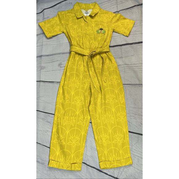 Disney Princess Tiana’s Bayou Adventure youth jumpsuit costume in size 5/6. Bright yellow zip up one piece with a floral inspired pattern, short sleeves, and a matching tie belt for a cute, comfortable fit. Features a character patch on the chest and wide leg styling, perfect for dress up, Disney trips, Halloween, theme parties, or playtime.