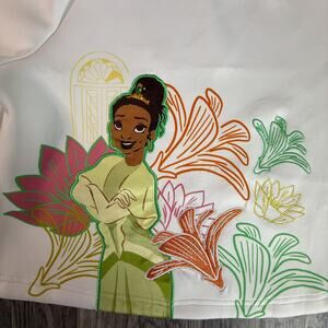 Celebrate the magic of Disney with this vibrant Princess Tiana crop top in girls’ size 13. Features a soft white fabric with stunning multicolor floral embroidery and a large graphic of Princess Tiana. Perfect for fans of The Princess and the Frog, this tee has a relaxed fit and mid-length sleeves, ideal for casual wear, Disney trips, or themed events. Lightweight and comfortable, it’s a great gift for any Disney lover.