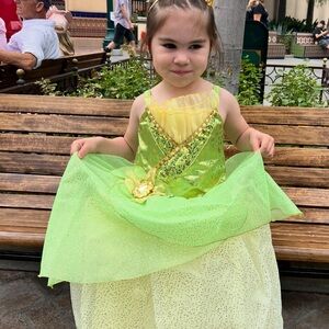 Excellent condition princess Tiana dress with gold tiara and green wand.