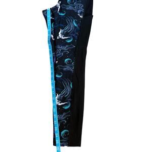Disney Princess Villains leggings featuring Ursula from The Little Mermaid in an allover galaxy-inspired print. Black with purple, teal, and blue accents, plus solid black side panels. Tag size 00 / XS. Fabric: 83% nylon, 17% spandex. Made in China. Cut date 01/2021.