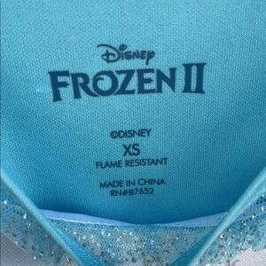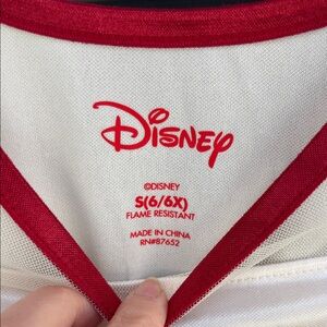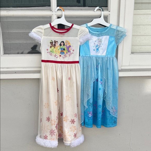 Charming Disney costume set featuring beloved characters. Cream dress with princesses and faux fur trim/red trim (6,6x); and blue dress with Frozen theme (5T). Perfect for dress-up fun.
