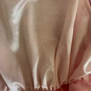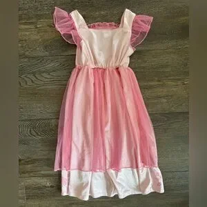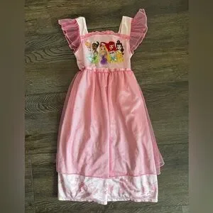 Soft pink Disney Princess fantasy nightgown. Black printed logo and care text. Lightweight knit fabric. Cute branded kids' tee style.
