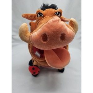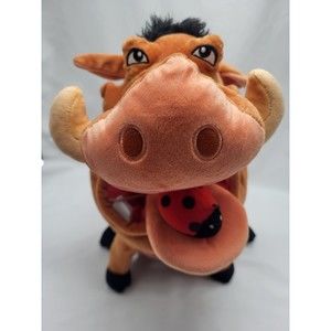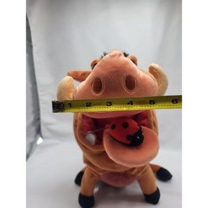 Adorable and wonderful condition Disney Pumbaa. He has a ladybug that hangs down on a string from his mouth or sits in his mouth. He is missing his green worm. Otherwise in perfect ultra clean condition.