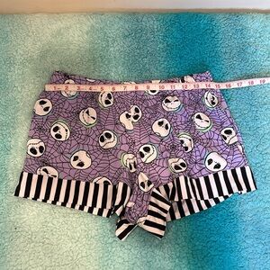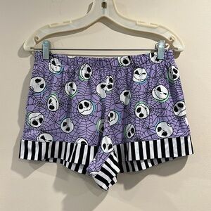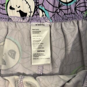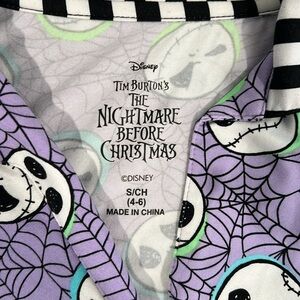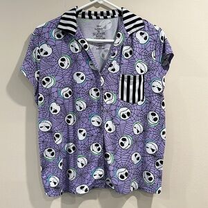 NWOT This delightful Disney pajama top showcases a charming pattern of cartoon-style skulls on a vibrant purple background. The short-sleeved design is accentuated with black and white striped trim, adding a playful touch to your sleepwear collection. Crafted from soft, comfortable fabric, it's perfect for a cozy night's rest.