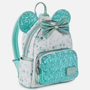 Charming Disney backpack with holographic mint accents. Features beloved character prints and sequins. Ideal for Disney fans! Loungefly Rare