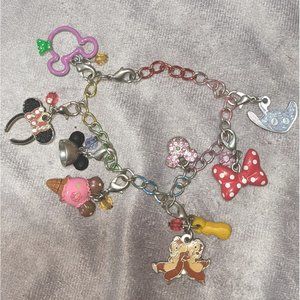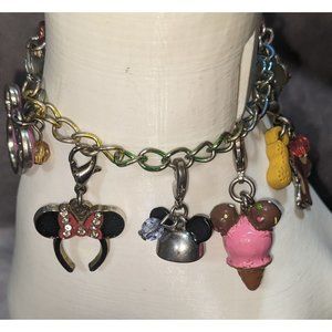 Fun and collectible rainbow charm bracelet by Disney. It is on a silver tone chain that has a sectioned rainbow coating. It is packed full of collectible charms, including a stingray, Minnie's bow, a silver tone Mickey mouse head with pink rhinestones, Chip and Dale with a silicone peanut, a pink Minnie mouse ice cream cone, vintage style Mickey ears, a rhinestone Minnie mouse headband, and a open Mickey head charm with enamel coating and a green accent that looks like half of a bow. This bracelet has been well loved so some of the rainbow coating has chipped off some of the chain, and the pink rhinestone Mickey head is missing one rhinestone. Perfect for Disney collectors.