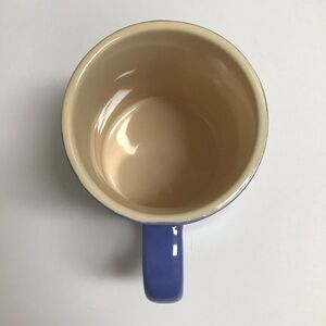 SET of two mugs are in excellent preowned condition; no chips or cracks. Thick, restaurant-quality ceramic coffee mugs; one of the mugs is ivory with a lime green interior. The second mug is periwinkle blue with a cream interior.