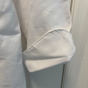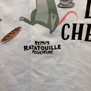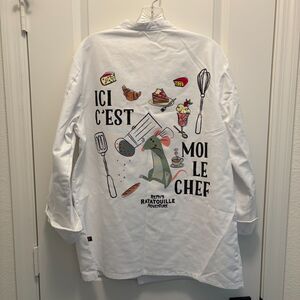 Disney-themed chef coat! Size medium. Perfect for culinary pros, Disney fans, or park-inspired cosplay. New without tags. The white jacket features: Remy “Chef” design on the front; Large colorful back print with “ICI C’EST MOI LE CHEF” (French for Here, I’m the Chef!); Durable double-breasted style with classic chef collar;Long sleeves with foldable cuffs and front pocket. Polyester 63%, cotton 37%. Approx. measurements: pit to pit 23", shoulder to bottom 28".