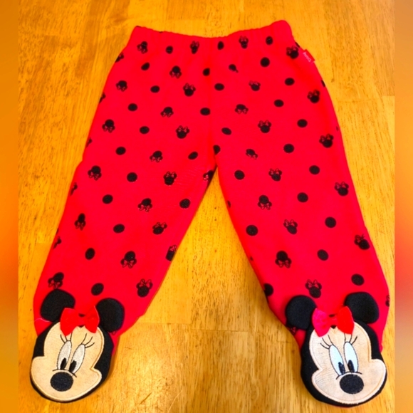 Charming red pajama bottoms with Minnie Mouse design. Features playful polka dots.