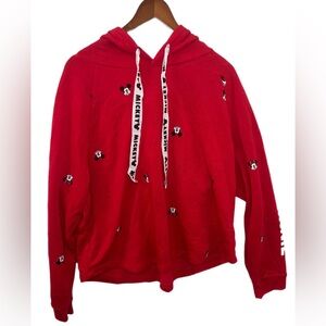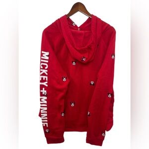 This vibrant red Disney sweater is crafted from a comfortable cotton blend, featuring a pullover style with a cozy hood. Adorned with charming decorative elements, it offers a playful touch to your casual wardrobe.