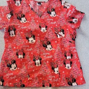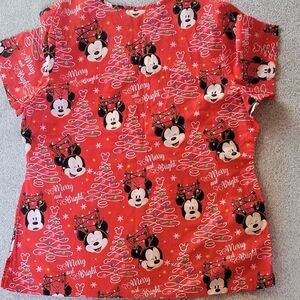 This vibrant red uniform top Mickey Mouse print, showcasing classic black and white faces against a bright background. lightweight