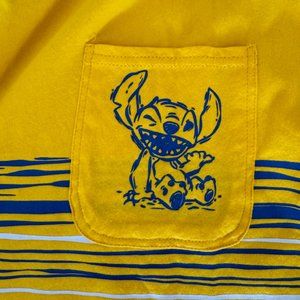 Design: The T-shirt showcases a playful blue screen print of water waves, with Disney's beloved character Stitch adorning the front pocket, adding a splash of whimsy and charm.