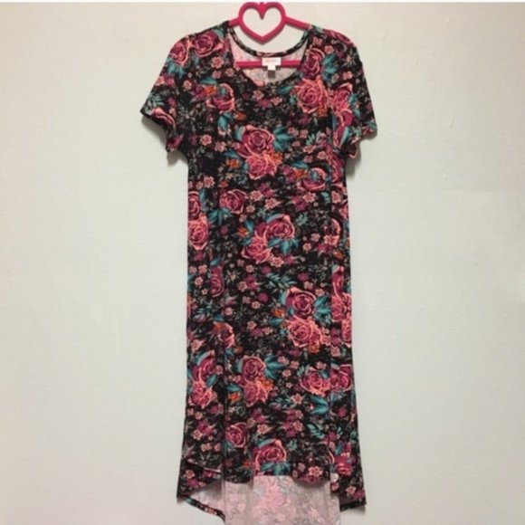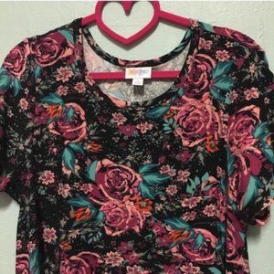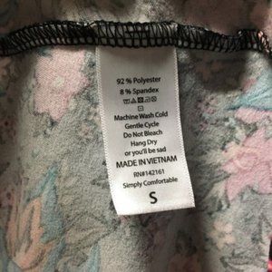 EUC S Carly in Disney roses print. Leggings material. Black background with shades of pink flowers and teal design. Smoke free, pet friendly home. Washed on gentle and hung to dry. Made in Vietnam. Offers welcome.