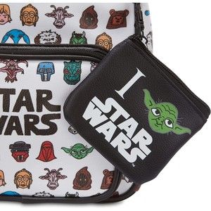 HANDBAG DESIGN: Features an allover character print of Darth Vader, Princess Leia, Yoda, Luke Skywalker, Chewbacca, R2D2 and many more on the backpack and a direct print of Yoda on the detachable coin purse. The mini backpack purse has a main zipper compartment and front zip pocket for additional storage. It s the ideal travel bag for school, concerts, and festivals.