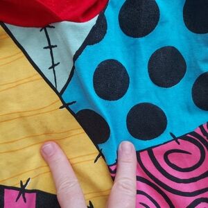 Nightmare Before Christmas hooded Sally costume. This eye-catching Halloween costume showcases a lively patchwork design in bold red and blue hues, complete with an asymmetrical layout that adds a unique flair. A couple of small stains may come out in wash.