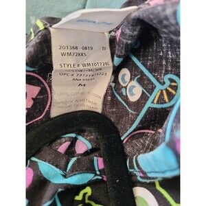 The Disney Scrub Shirt in size Medium features a black patterned design inspired by Monsters Inc. Made of 100% cotton, this top is designed specifically for women in the medical industry. With its comfortable material and fun Disney branding, this shirt is a stylish and practical choice for healthcare professionals looking to add a touch of personality to their work attire.