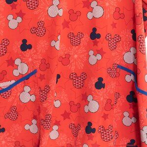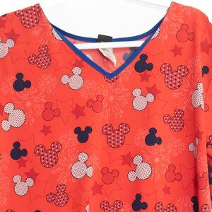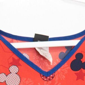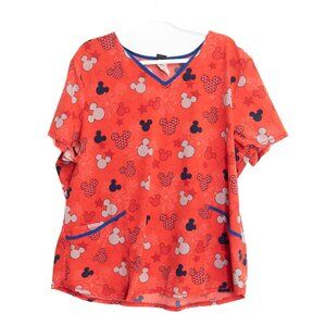 Disney Size 2XL Mickey Mouse Print V Neck Scrub Top Red Navy Blue Trim