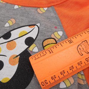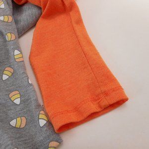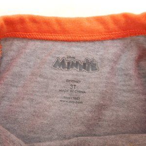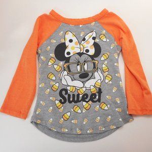 1. Raglan sleeve shirt with Halloween Candy Corn Minnie Mouse print on the front in gray and orange