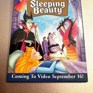 Disney’s Sleeping Beauty Collector’s Pin Coming Video September 16. The size of the pin is 3 inches by 2 inches. There is discoloration on the back of the pin, see photos.