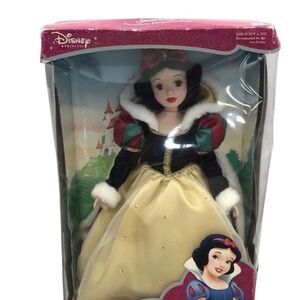 This Brass Key porcelain doll is part of the Disney Royal Holiday Edition, featuring the beloved character Snow White. The doll is 16 inches tall with black hair and brown eyes, crafted with a beautifully detailed design. It is a licensed reproduction from the official Disney Princess Collection, manufactured in China between 2000-2009. The doll comes in its original unopened packaging and is suitable for collectors aged 17 and up. Condition is new in box.