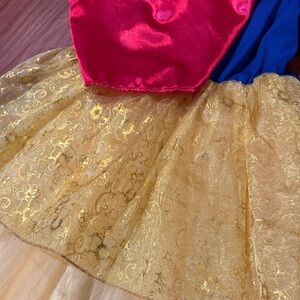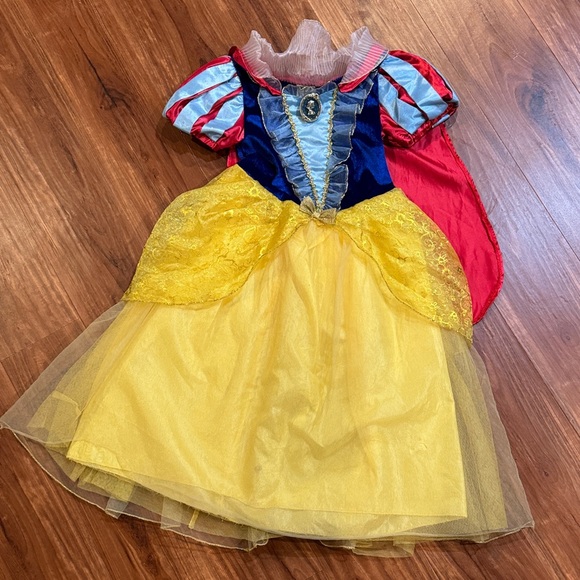 Charming Disney costume inspired by Snow White. Features bold red, blue, and yellow hues. Ideal for Halloween or dress-up. There is a small hole in the front of the skirt. See pictures for details.