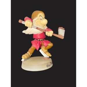 A whimsical Grumpy figurine bobble head from Walt Disney World. Depicts Grumpy playing hockey with detailed craftsmanship, perfect for collectors or Disney enthusiasts.