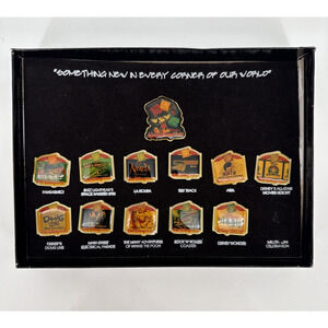 Rare Disney “Something New in Every Corner of Our World” Pin Box Set (1999) from the Walt Disney World Millennium Celebration. This collectible vintage set originally included 13 pins, but 1 pin (Millennium Celebration) is missing. The remaining 12 pins are included and in great display condition.