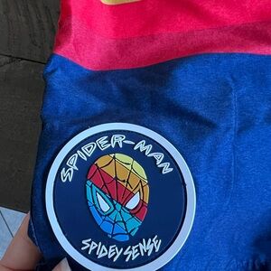 Colorful Marvel shorts with bold stripes. Features a fun Spiderman patch. Perfect for young fans. Great for Disney Day or Disney Cruise. Rash guard, swim trunks and sunglasses.
