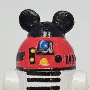 Introducing our Disney Star Wars R2-D2 with Mickey Mouse Ears Hat SMALL Plastic Figure, where two iconic worlds collide in a delightful fusion of magic and adventure. This small plastic figure showcases the beloved astromech droid R2-D2 donning a black hat adorned with Mickey Mouse ears.