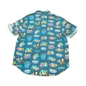 The Disney Star Wars Under the Twin Suns by Jeff Granito Button-Up Shirt in Men's size S is a graphic print shirt featuring a collared neckline and short sleeves. Made from a blend of viscose and cotton jersey fabric, this shirt is machine washable and suitable for various occasions such as travel, parties, or casual wear. The shirt's blue color and space-themed design make it a great choice for those who are fans of Star Wars and enjoy a mix of hipster, geek, and retro styles. With its regular fit and breathable features, this shirt is perfect for all seasons. Measurements in photos.