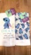 ~Colorful big stitch~Ohana in blue letters~Writing in cursive “means family nobody gets left behind or forgotten”~White background ~2nd towel has colorful little stitch all over~ Gray background ~White bottom border~